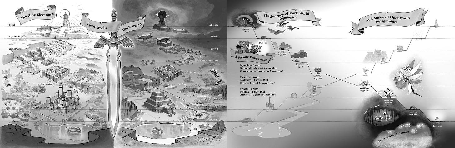 As shown on the right illustration, The Journey of Dark World Topologies is linear, which is to say the adventure simply descends in elevation from high to low. However as you can see from the banner titled Parody Progression – this descent is reordered according to a philosophical schema that structures how the chapters are laid out.